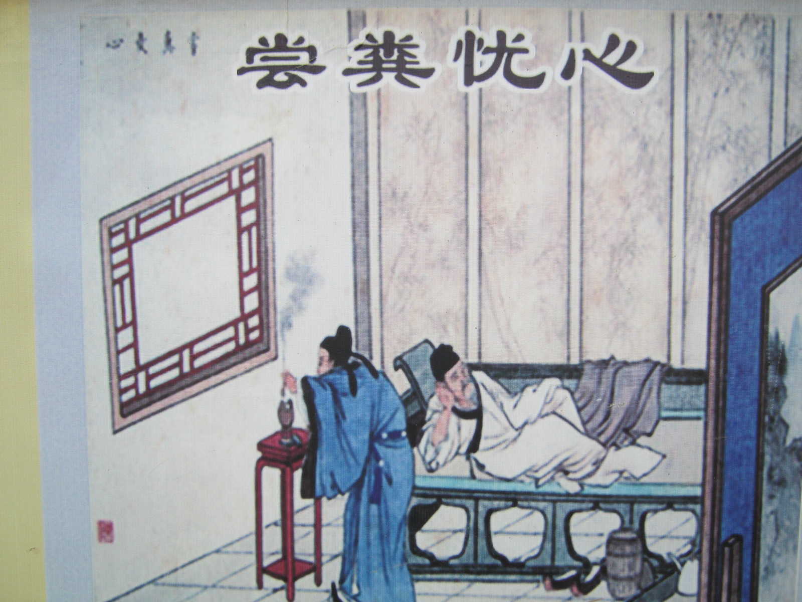 “尝粪忧心”讲的是庾黔娄的故事,他当上县令不满十天,预感家中有事,当即辞官返乡。回到家中,知父亲已病重两日。医生嘱咐说:"要知道病情吉凶,只要尝一尝病人粪便,味苦就好。"黔娄于是就去尝父亲的粪便,发现味甜,内心十分忧虑,夜里跪拜北斗星,乞求以身代父去死。