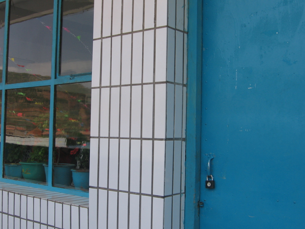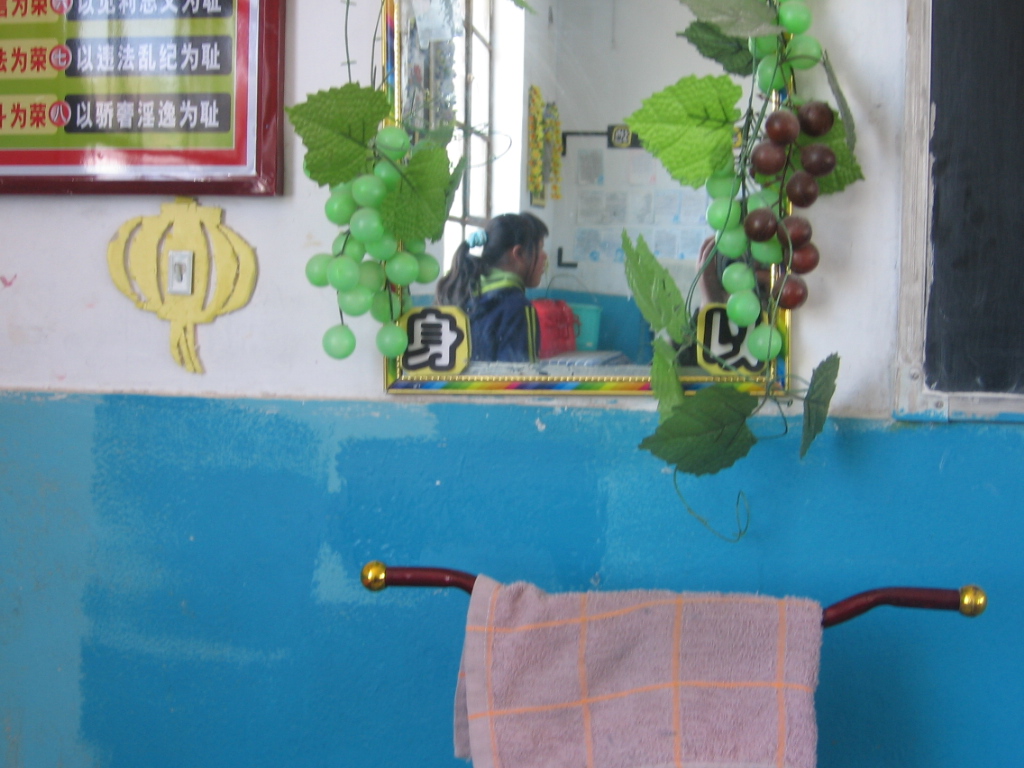 前面黑板的左面是我们洗漱打扮的地方,墙上装有一块镜子上面贴着“以身鉴证”的标语,下面放有洗漱的套具。这样我们我们每天都不用脏手吃东西了。