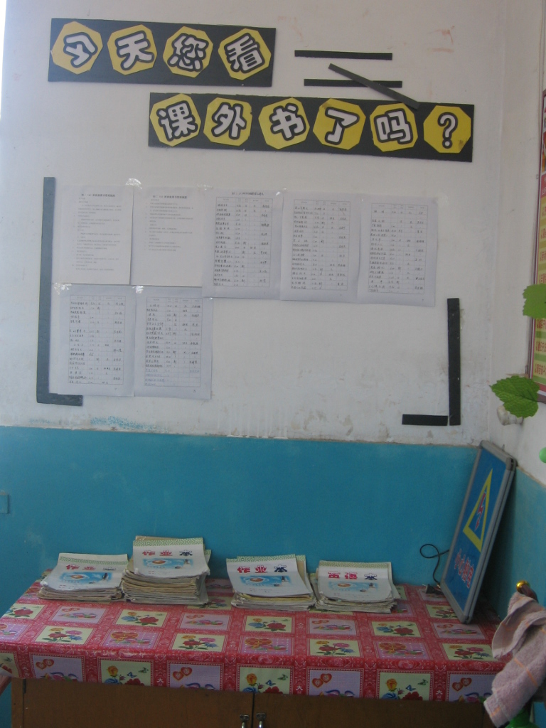 进入教室,映入眼帘的便是我们课外学习的地方。墙上面标着“今天你看课外书了吗?”九个大字。以及借书制度和图书名称。下面是装图书的小柜子,也是我们放作业本的地方。自创图书室的建立,是我们学到很多知识。