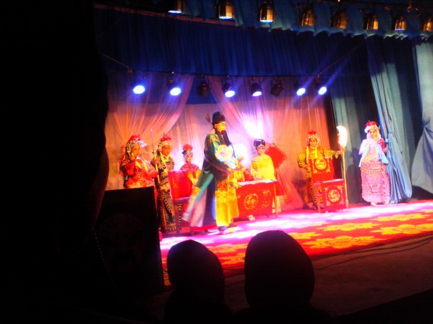 大幕拉开,生、旦、净、墨、丑悉数登场,干惯了农活的乡亲只要一登台,一招一式确也风韵无限。当然也有蹩脚的演员,不是忘了词就是跑了调,或是晕了台,手足无措木在那里。台下的观众颇有点裁判员的味道,每个演员登台出场都要评头品足一翻,台上扮演的包公唱串了词,台下一连串的嬉笑怒骂,李四演的春红灵巧动人,引得台下齐刷刷的伸长了半尺的脖子,看到入境时和台上的人物一齐长吁短叹,一齐手舞足蹈,台上台下形成共鸣。