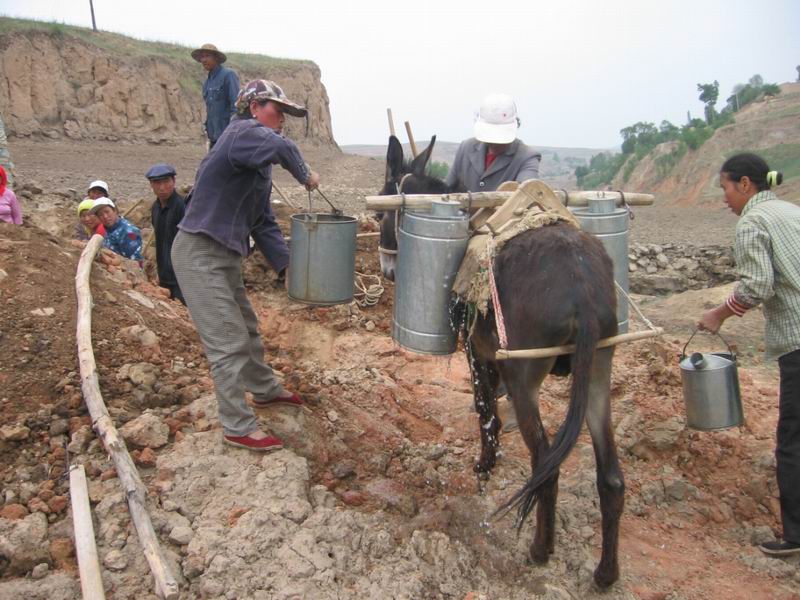 村民们开始用牲口去驮水。村民们就拉着驴去驮水。