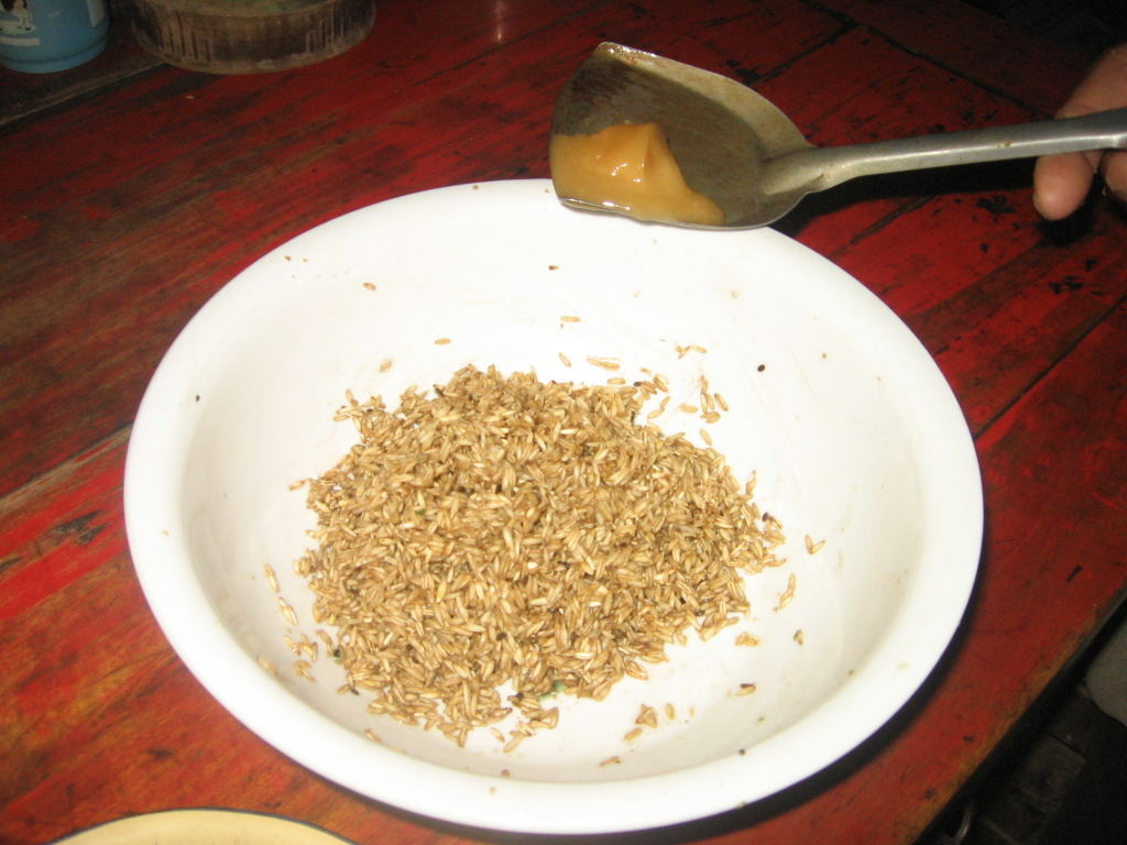 这时,它是生的,我们不能吃它,因此我们就将它炒熟,然后我们将蜂蜜和莜麦混和在一起,搅拌均匀,最后,将它们弄出来凉一会。