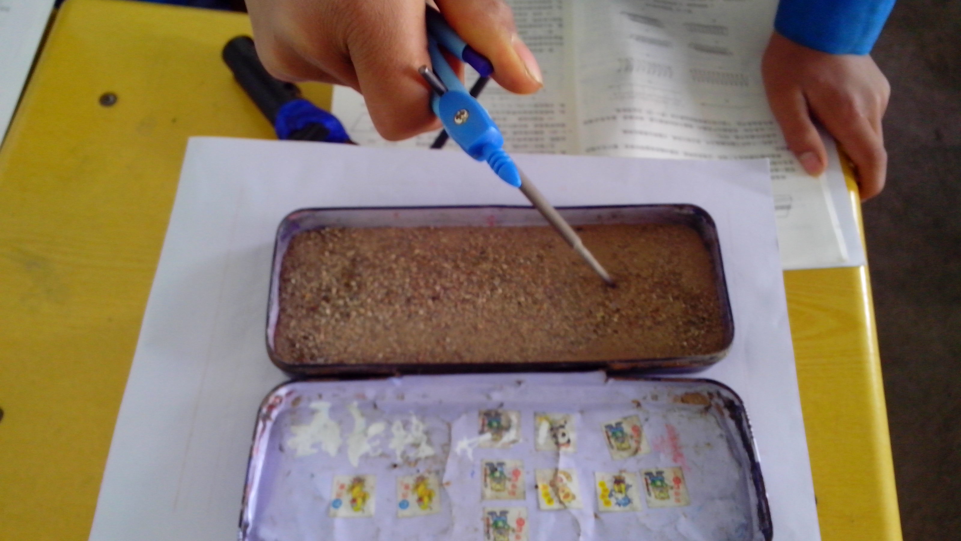 我的焊接模拟器很简单,就是用废弃圆规的一个腿做焊钳,把焊条夹持住,简单的焊钳就只做好了。那么在哪里焊接了?我自制了一个简单地沙盘,怎么说了,严格说就够不上个沙盘。一个废弃的铁盒子的盖,在里面装上细沙。这样我的焊接模拟器就算制作成功了。