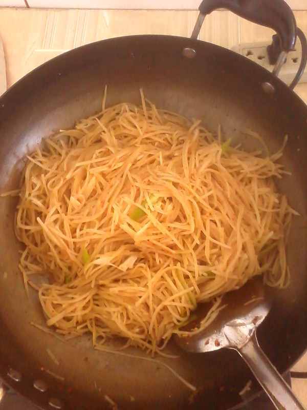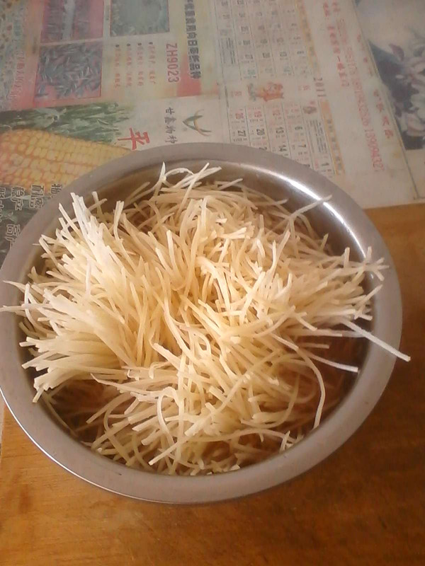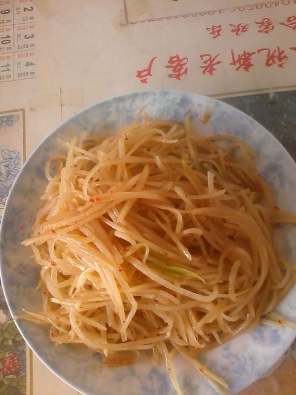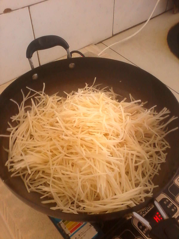 首先,我将削好皮的土豆切成丝儿,浸泡在水中。然后我将油倒进锅里,尽量要开在中火上。待锅中的油刚冒烟时,就将土豆丝倒入油锅里。其实我最怕往油锅里倒菜里,第一次炒菜的时候,我就被烫伤过。