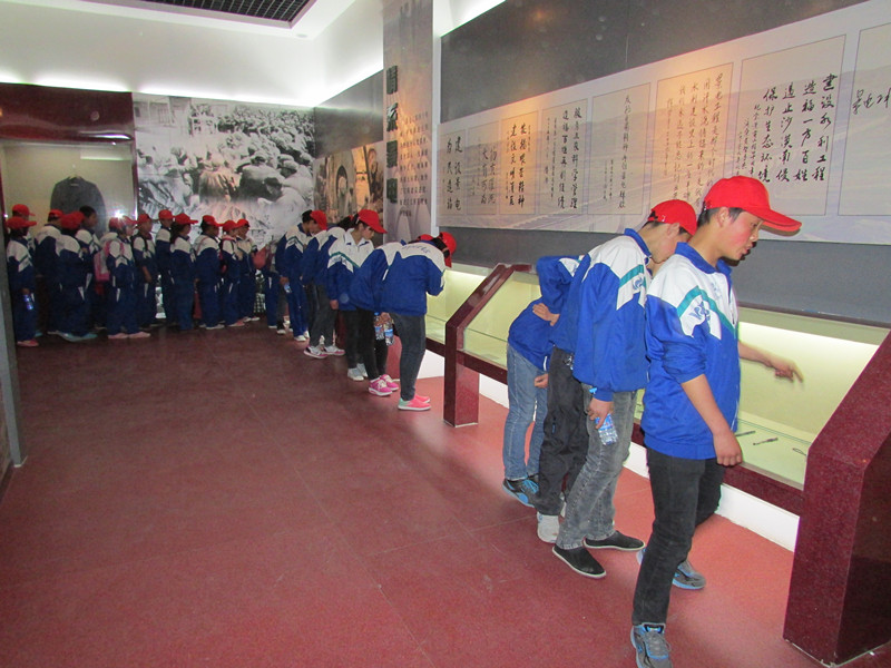 随后,我们参观了"景电工程博物馆"。进入馆内,首先映入眼帘的是一个看是真实的建筑物,那是景泰川提灌工程模拟图。我们从左边走过去,那里有李培福爷爷的铜像,周围一片全是花篮,大厅内有各级领导对景电工程的题词。墙上还有开发景泰川一期、二期工程的规划图以及提灌示意图。周围还展出了景电工程英雄们用过的工具,衣物。还有李爷爷的笔墨纸砚和拐杖等。一件件珍贵的历史图片和展品,生动再现了老一辈建设者当年苦战景泰川水利工程的情景。一边看照片一边想,最后从右边出来,回到大厅。再看模拟图,真的是心潮澎湃。