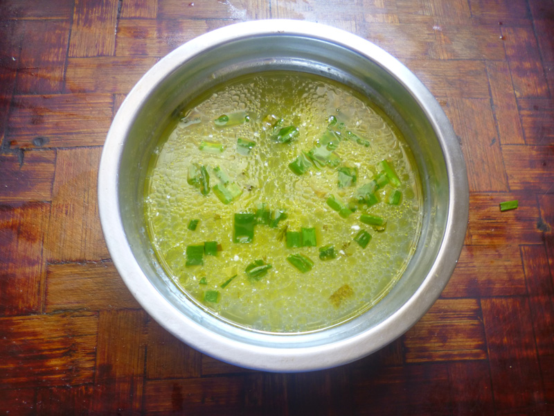 把浆水用油过一下,在放一点葱花与香菜,就可以下面了,等到面下熟后,把面捞进浆水里,就可以吃了,松滑弹香,让人回味无穷。