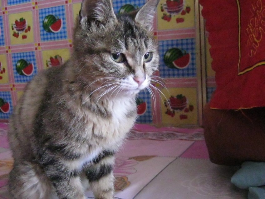 “咪咪”的眼睛绿莹莹的,像两颗闪闪发光的绿宝石。耳朵似小白兔那样顺风竖着,也像小朋友们玩的积木中的一对三角形,还会灵活的转动呢?鼻子嗅觉灵敏,如果买了鱼,它老远的就能闻出鱼腥味来,围着篮子“咪咪”直叫。饭后,我把鱼头、鱼尾、鱼汤拌在饭菜里喂它,它欢快地摇着尾巴,“咪咪”的叫着,三口两口就吃完了。