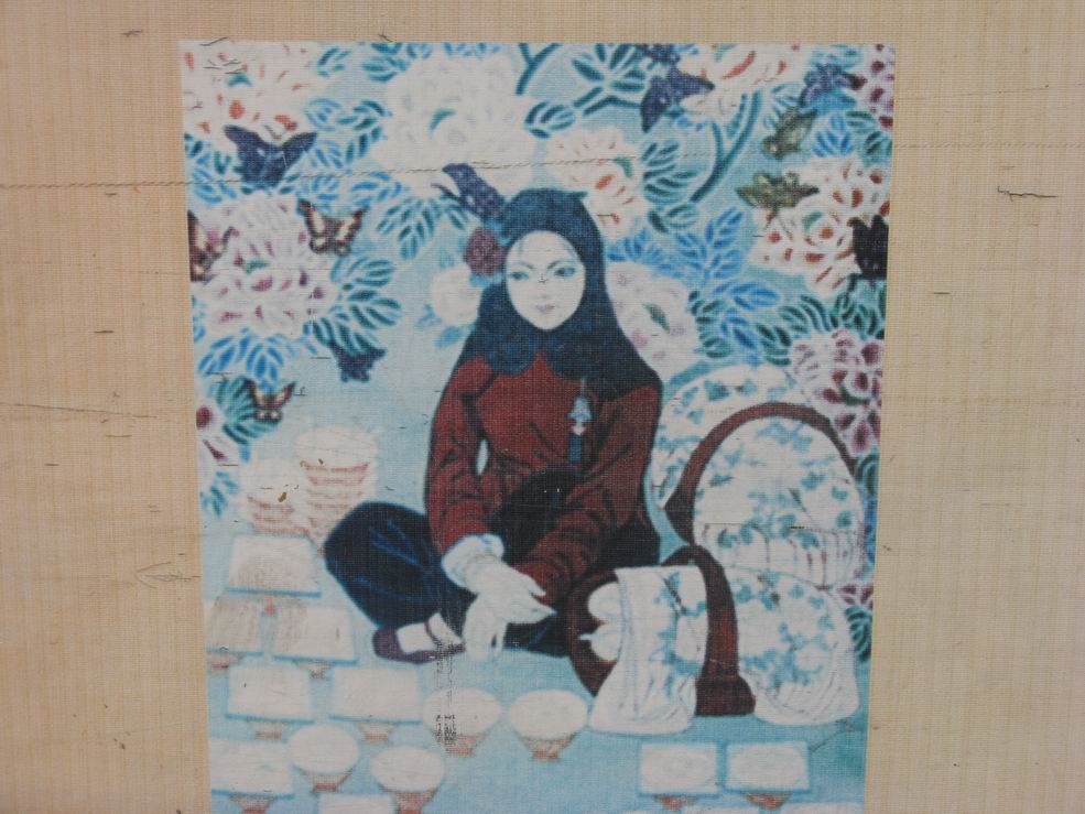 这一张大家可能不熟悉吧,画的是一位回族的阿娘提着自家的竹篮在卖酸奶,说起酸奶,真是非常有名的小吃,一到夏天大家最爱吃的就是酸奶了,酸酸甜甜的又解渴又解饿。看到这位阿娘穿的衣服了吗,这就是我们回族结了婚的阿娘的典型穿戴了。