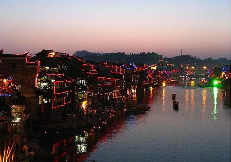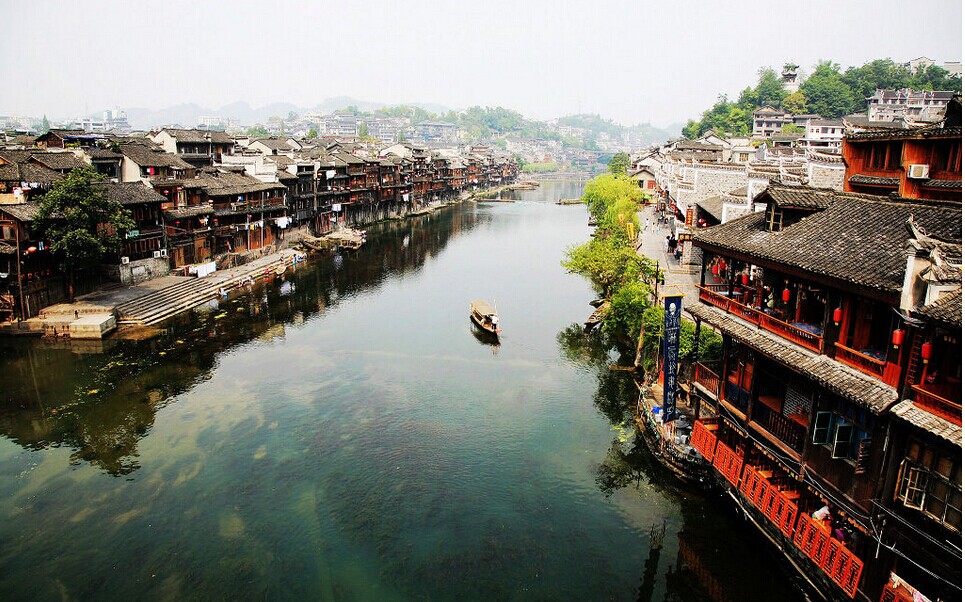凤凰古城最有名的是那一幢幢古色古香、富有浓郁土家族风韵的吊脚楼,但河畔的吊脚楼大多已不在了,只有在回龙潭那里尚留有十多间老屋,细脚伶仃的木柱立在河中,托起一段沉沉的历史。