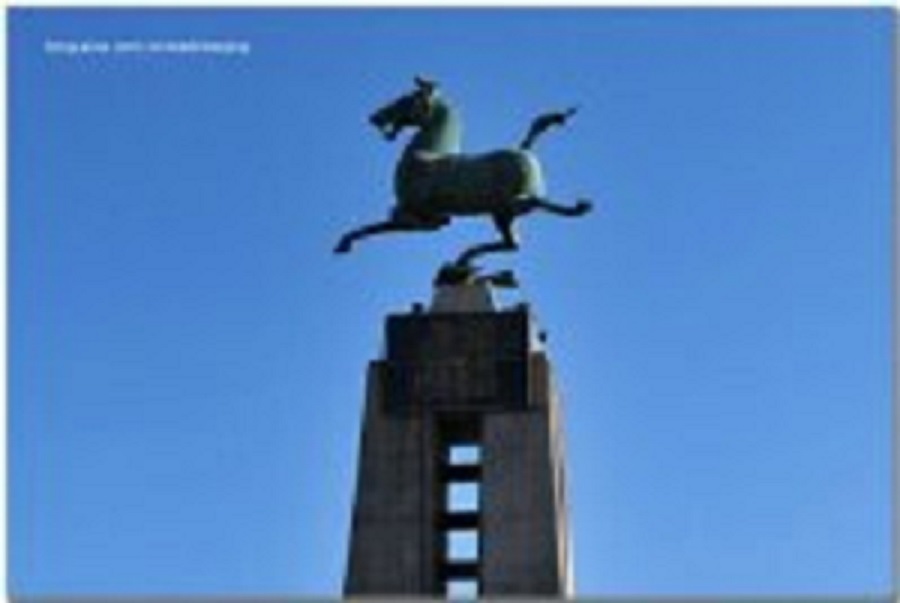 武威是一座古老的城市,素有"凉州"之称,来到广场,最吸引人的是一座"马踏飞燕"雕塑,传说古时候有一匹天马,跑的特别快,竟然踩到了一只燕子身上,这座 雕塑是武威的标志,吸引了许多中外游人。