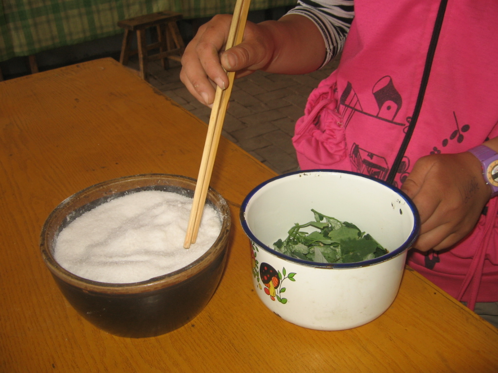 接下来就要晒灰菜了。灰菜有两种做法。第一是晒,将灰菜晒干。第二,将刚掐来的新鲜灰菜直接做。做法是烧一锅沸腾的水将灰菜倒入锅里,用烧水炸一会儿。也可以将灰菜晒干放到冬天炸着吃。
