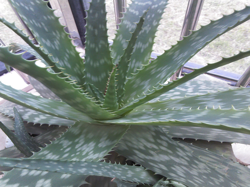 芦荟的叶子一层一层叠起来,就像金字塔一样,叶子长得很宽,厚厚的,下大上小,两边都是齿,就像一把把双面锯子。