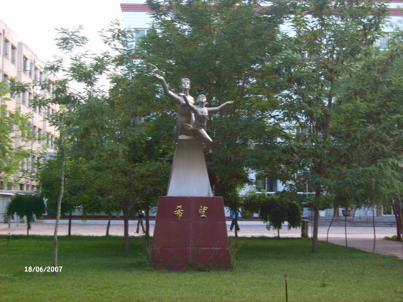 在草坪的中央,屹立着一尊铜像,上面用镀金镶嵌着“希望”二字。我时常也会凝望着它思考,是呀!学校是知识的天堂,是为我们铺向“希望之地”的道路。只有现在好好念书,将来前途才是一片光明。
