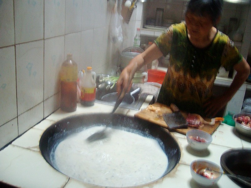 爷爷去磨豆浆,奶奶就在家里忙开了,做好其它的菜,爷爷也提着一大桶打好的豆浆回来了。