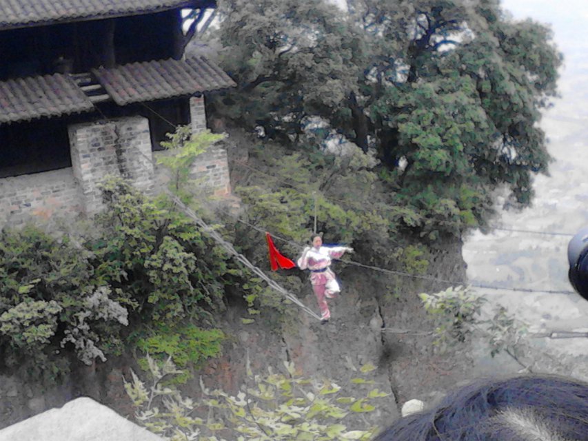 但女飞人担纲铁索表演,确实让游客闻所未闻!只见一名身着粉色表演服饰的美女,时而宛如凌波仙子健步如飞,时而恰似翩然惊鸿巧妙地翻转、腾跃,声声娇喝直冲云霄,博得围观游客喝彩连连、掌声雷动。