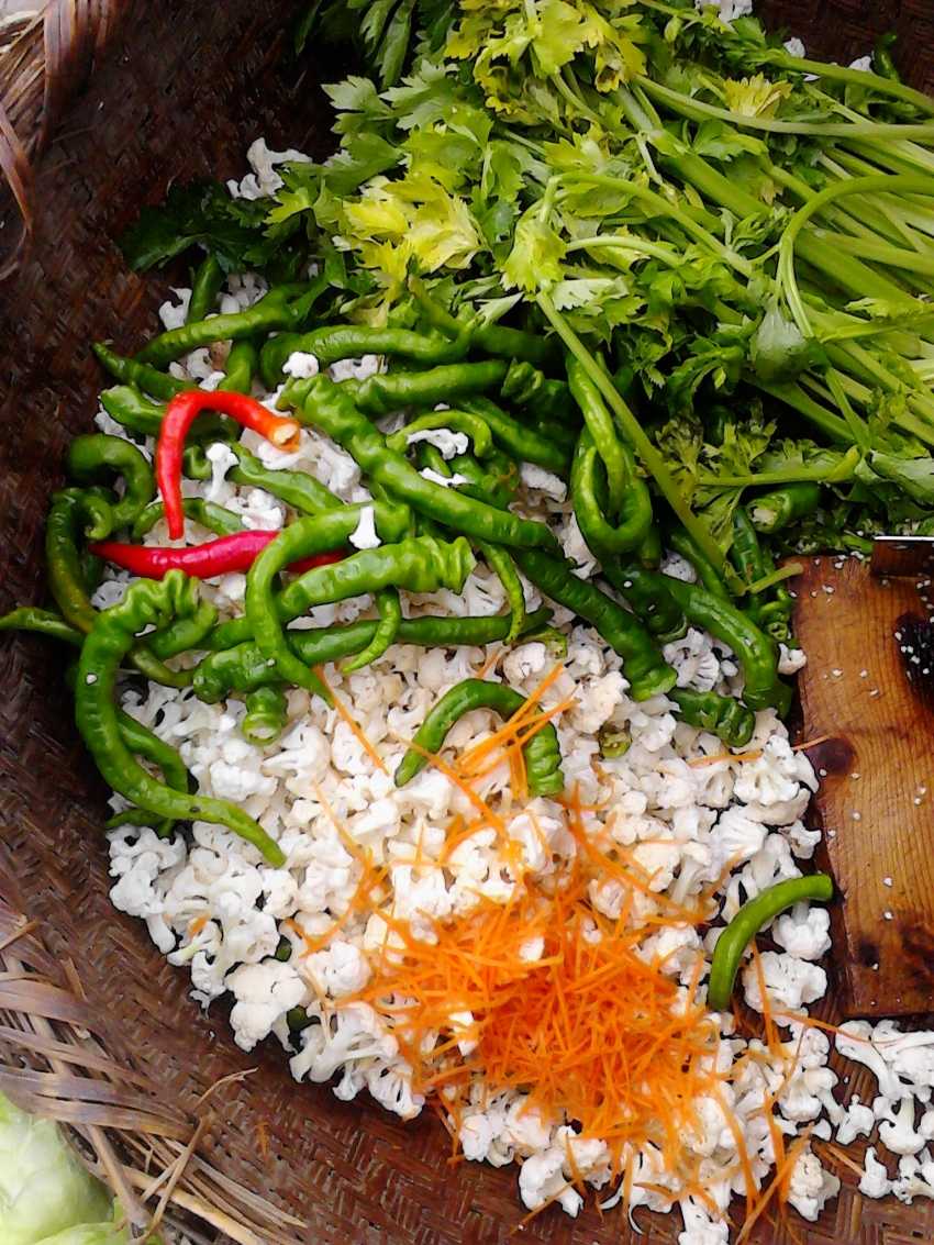 刚出锅的菜还需要在冷水里浸泡一会儿,便可以放到菜板上切了。看吧,五颜六色的蔬菜看得人眼花缭乱,让人情不自禁的流口水。在仔细一看,奶奶和妈妈的娴熟的刀工,更让人心生敬畏,只可惜我不会。这就是在农村人们口中所说的“熟菜”。