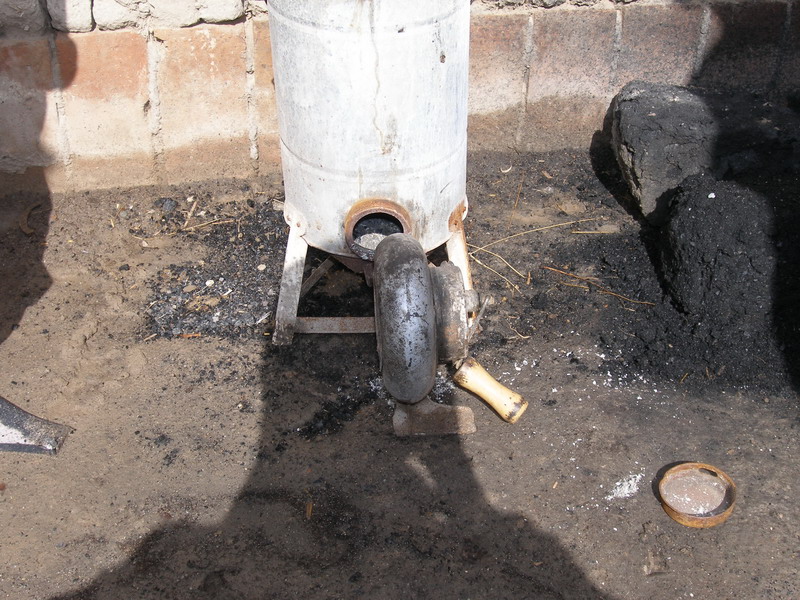 看,这个小家伙正在帮助火炉。把吹风机按放在火炉的下面,用手抓住吹风机,用手摇几下,火就能着起来。它可是不可缺少的一部分。