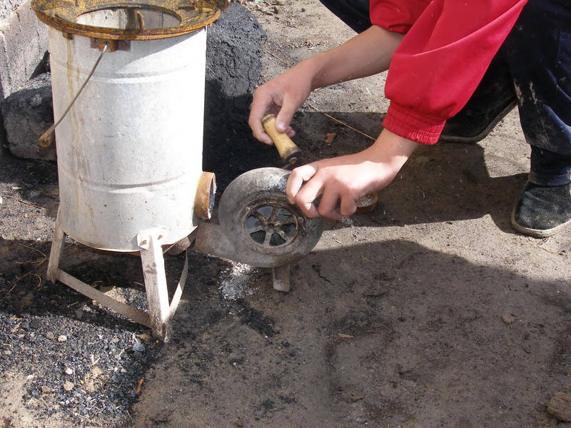 这个小小的炉子手摇吹风机,它能帮助火炉,当火炉不着时,用它可以来帮助,可别小看这个小家合伙,它的风力可大了。