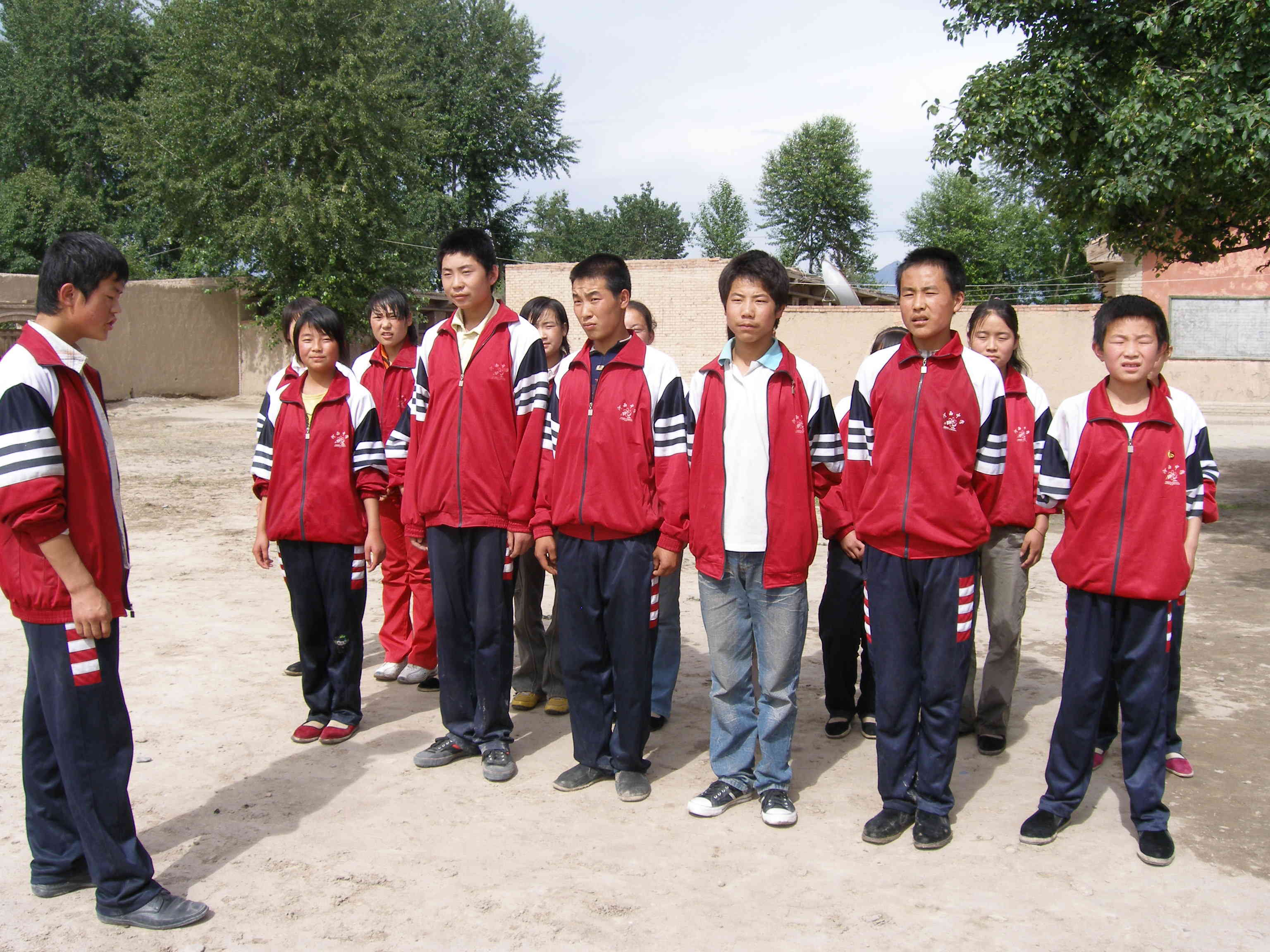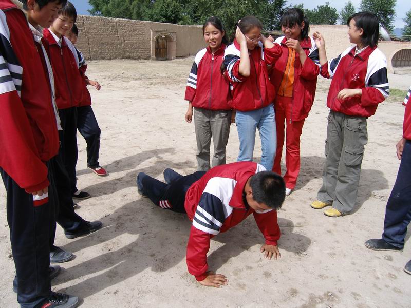 看,这是他带着同学们,正在训练,同学们做的多么认真,多么仔细。他们的身体多么强健有力,这就是他们苦炼的结果。