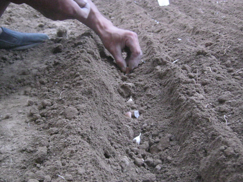 1. 先锄好一片地,然后再将蒜掰成一个个瓣儿形的“兄弟”。2. 用锄头锄出宽度,长度一样的小山沟进栽种,在栽种时注意将蒜头朝上,而蒜大的挨着地。