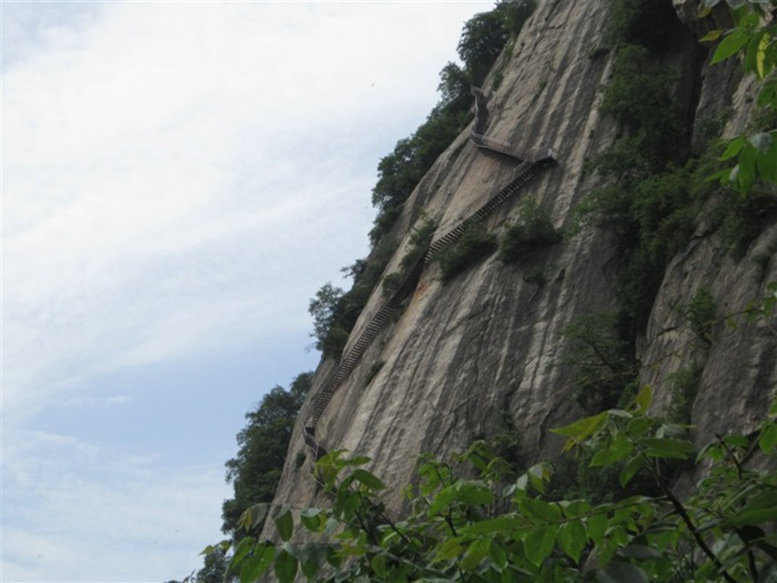 顺着一条木头铺的阶梯往上走,我们一群人带着欢声笑语,步伐轻盈,转一个弯,再转一个弯,不觉疲劳。不知走了多长时间,上了多少台阶,忽然我们其中一员指着远方喊道:“快看,快看!”顺着他手指的方向,“哇!”—我们异口同声的喊了出来,只见一做山像是被刀切掉一块,整齐灰白色整齐的切口,高高的屹立在绿色的群山间,像一张巨大的银幕,红色的栈道之字形的蜿蜒攀附在这张巨大的银幕上,加上峭壁山零星冒出的树枝,简直就是一副奇大无比的古画立在山间。自然的神奇,人类的智慧让人不得不折服。本来就很兴奋的我们更加雀跃,一股莫名其妙的力量涌上心头。真是“事非经过不知难”呀!开始,我一直奔跑在队伍的最前面,那些大哥哥们看我如此活跃只是笑了笑。最后,我才知道我体力已经不支了,可是我想,我要坚持,不能让他们看不起我。但在一番坚持之后,我终于支撑不住了,落在了其他人的后面。这时表哥过来拍着我的肩膀说:“张玏,能坚持到这里的确了不起,但干什么事都要想想结果,并且要考虑以后,你开始一个劲跑不但没有超越我们而且消耗了你的体力,现在跑不动了吧,这就是不顾后果的结果。”于是,为了等我,队伍停下了休息。然后,我们又向山顶出发了。