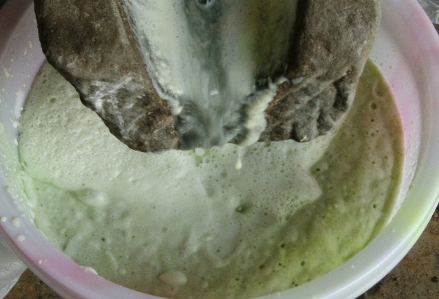 唉,豆子太多了,又难剥,好不容易才剥完,足足一大盆。接下来我就和妈妈一起推豆子,妈妈一把一把地往磨子里添,豆浆就从四周流了出来,然后又流到桶里。不大一会儿,豆子就全部被磨成了浆。