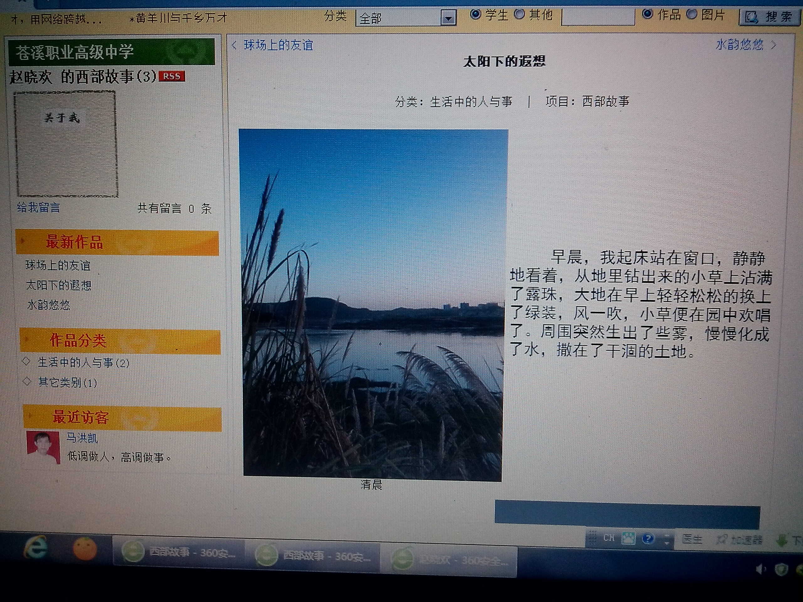 在《西部故事》里我不仅可以尽情地写作,也可以去观看其它和我一样热爱写作的小作者的文章,去取长补短,吸取经验,提升自己的写作水平。