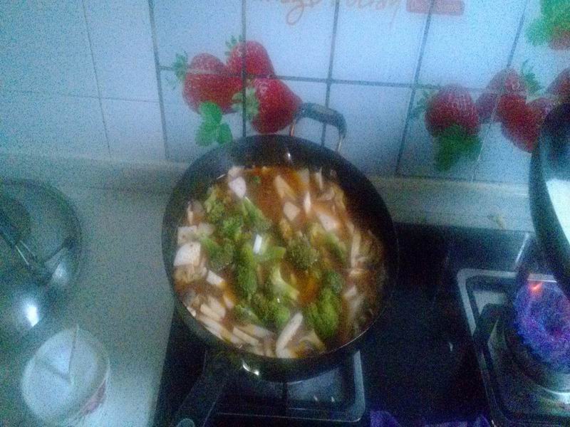 母亲拿出平时最好的手艺,她先在锅里倒上油,开启火,等着油温热了以后,先放葱和调料,不停的翻炒,等到葱上了颜色后,在把辣椒放进去,等到香味出来后,在把蒜放进去,那样会使味道更浓更香,然后再倒进一小碗水,等待着一碗水沸腾后,在把羊肉和宽粉放进去,然后盖上锅盖,等汁水达到一定的沸点后,浓浓的肉香味出来{最多只需要半个小时}再把穿好的蔬菜放进去,抄上一会,这样会使色香味俱全。