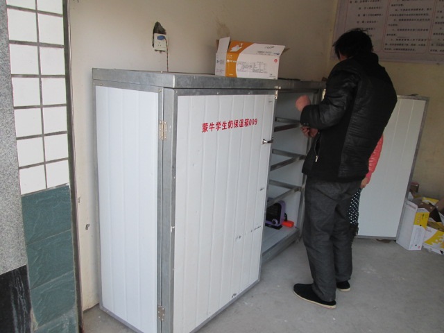 到底牛奶是怎么热的呢?原来啊,是蒙牛公司派送了一个保温箱,专门用来热奶的。保温箱规格不大,长1.2m左右,宽0.5m左右,高1m左右。外面是用铝皮包裹着的,内壁是塑胶,填充物是泡沫。内部横着的几个铁架子是用来放牛奶的。这个保温箱虽然不大,但一次性热的牛奶刚好够全校饮用。