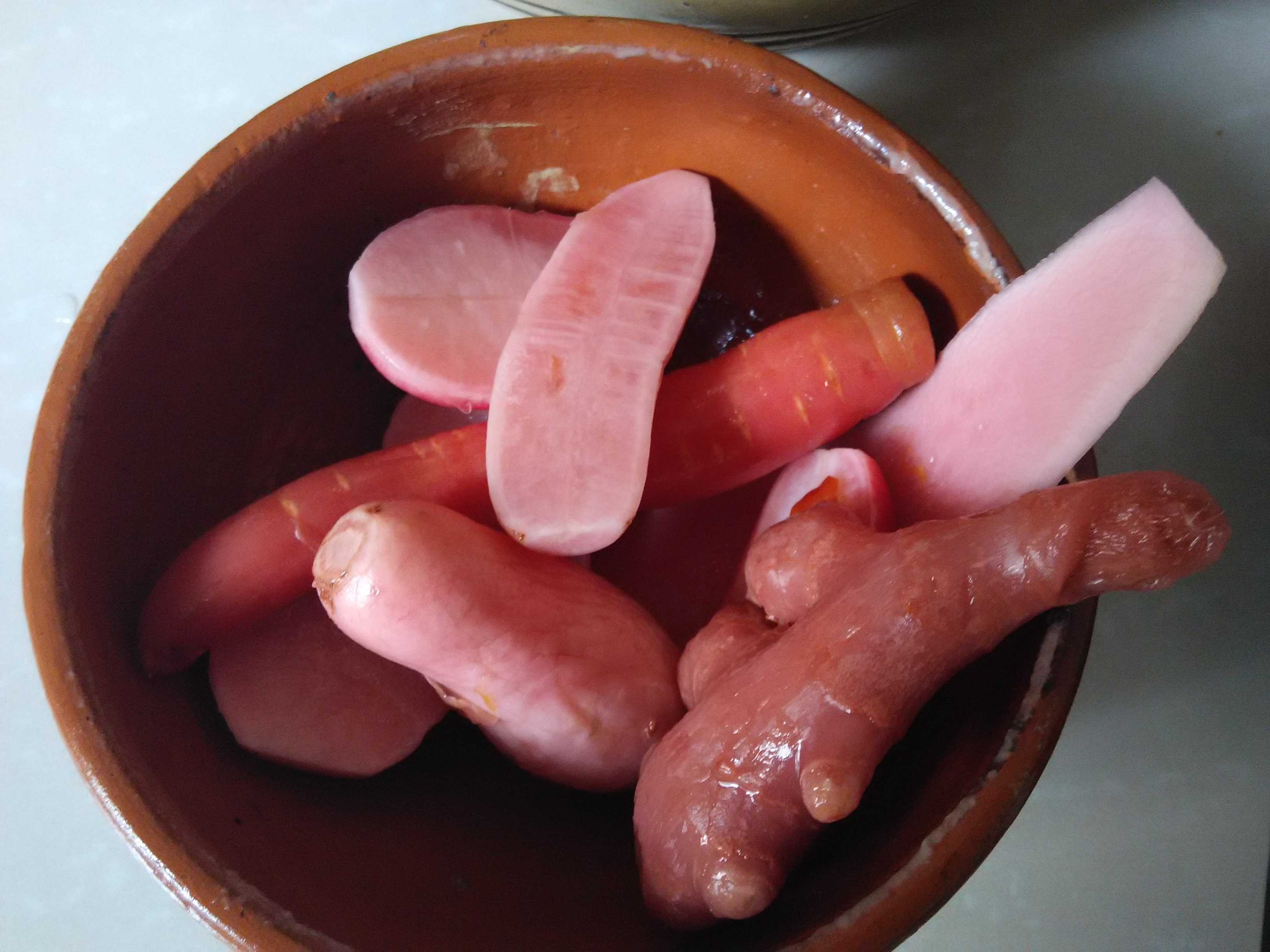 第二个步骤是将洗好的萝卜晾干。首先把萝卜装进盛饭的器具里,需要注意器具是否有油渍,因为有油的东西会使咸菜生花。记得有一次,我去捞咸菜时,因手上沾有油而后来使咸菜生了花,最后没有救活盐水只有被倒掉。母亲又才重新换了盐水,泡上了新的咸菜。我把装有萝卜的器具放到通风,有阳光的地方,方便空气很快把它们身上的水珠吸走。