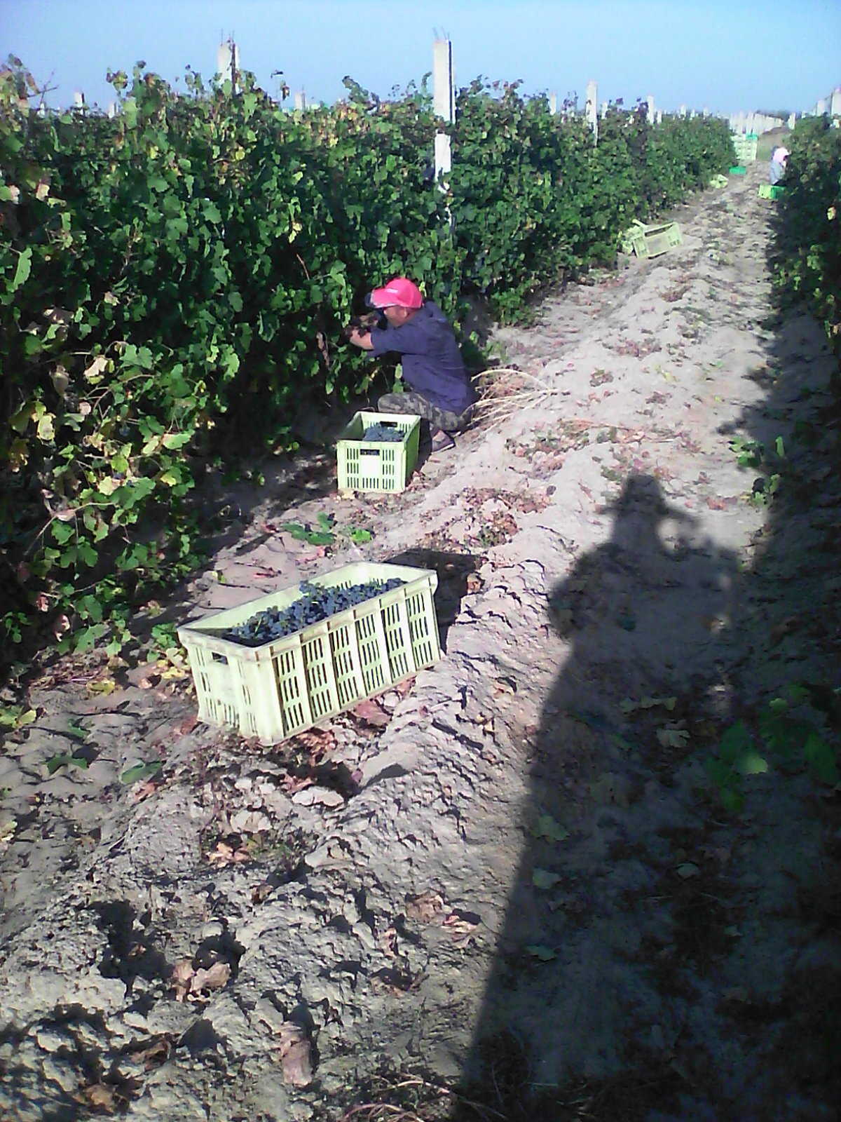 临近中午,我已经明白了我们这儿为什么把这个季节的太阳称为“秋老虎”的原因了,我已经满头大汗了。采摘速度已经跟不上爸爸了,但爸爸以及参与采收的叔叔、伯伯、阿姨们,他们没有半点松懈,依然用不同的身体姿势继续采摘葡萄,他们黝黑的脸庞上渗出了密密的汗珠,粗糙的双手不停的开合着剪刀、搬运着筐子,衣服上粘着葡萄糖汁与泥土的混合物,汗水在 许多人的后背上渗出并绘出一幅不规则的图画。他们没有过多的在意这些,继续俯身、弯腰在繁枝密叶间忙碌着,剪刀的“咔嚓”声,相互间的取笑声依然飘荡在田间地头。