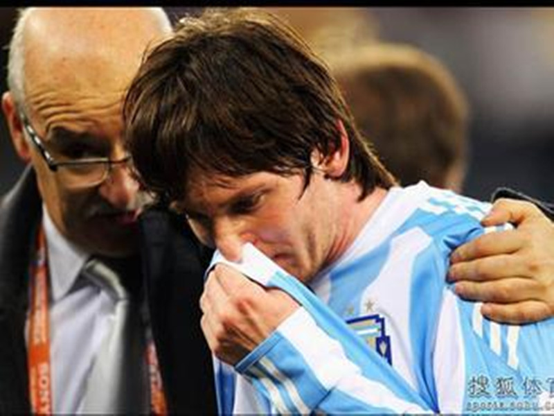 也许失败,悲情谢幕,这种残缺的美也是阿根廷吸引我的一部分,因为世界上最能打动人的艺术作品永远是悲剧而非喜剧。右边是一堆黑色的球衣。左下角是一个孤单的蓝白色身影――那是梅西,一个已经泪流满面的梅西。然后,所有的白色身影迅速向左下角靠拢。几秒钟后,在一大片的黑色外面,蓝白色成为一个“孤岛”,中心就是梅西。其实在克洛泽打进德国人的第四球后,梅西已经没办法控制自己的情绪。他孤独地站在中圈,眼中早已泪花闪烁。最后的几分钟,他是在一种情绪的焦灼中坚持完的。但即使这样,他依然完成了一次有威胁的射门。当乌兹别克主裁伊尔马托夫终于吹响结束的哨声,等于给梅西最后的解脱。南非,恐怕是梅西生命中不愿回首的经历。在这个被无数人封为“球王加冕仪式”的舞台,梅西最终没能打进一球,阿根廷人最终没能进入四强,就这样背着四个光蛋离开。