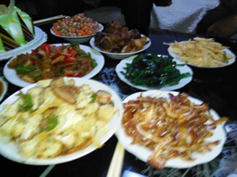 看看上得厅堂下得厨房的妈妈正在厨房里一个人“英勇奋战”炒完一个菜接下一个,一会看看微波炉里的东西,一会又开始在电灶上爆炒,一会又在火炉上做菜。我见了,只好去给妈妈打下手,让妈妈赶紧做好好赶紧开饭。看看一个个美味,有海白菜,酱花生,爆炒牛肚,卤肉,鱼,等等做好了我真想赶紧开饭。