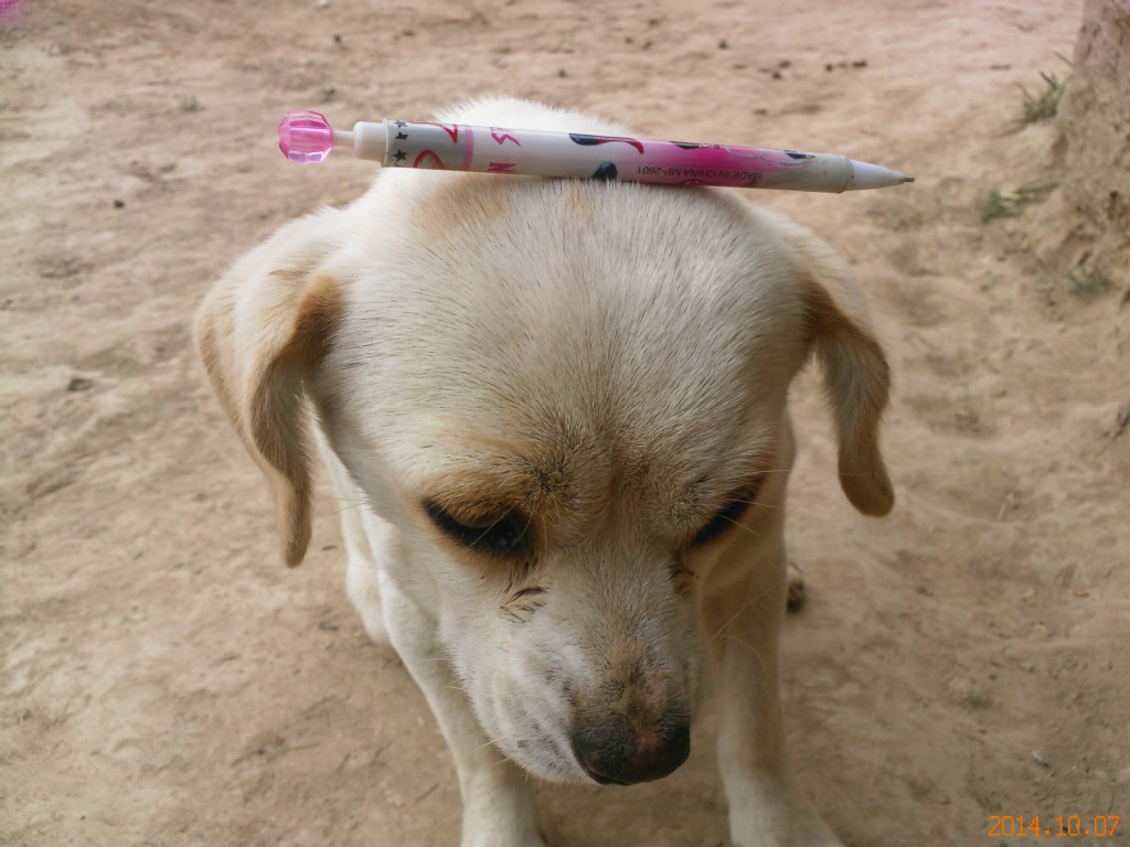 她也非常调皮。一天我写作文的时候要抄一下门口的对联,不料笔太不听话,不愿意老老实实地待在桌子上,掉在地下。我也没有太在意就出去看对联,回来后看见蕊儿蹲在椅子底下“专心致志”的啃着我的笔呢。她一定误以为那是好吃的呢。我想拿回笔嘿,她就是咬在嘴里不放。害的我又是恐吓又是哄的。我想了一条妙计,我去厨房拿了一块肥肉片丢在地上哄她过来吃,“来吧,小样儿,敢根我抢笔,你嫩了点。”我心暗自发笑。果然她丢弃了“啃”笔,吃起了肥肉片。这样我的笔才得以“虎口逃生”啊。