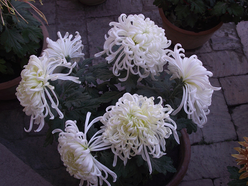 有的菊花还是花骨朵,它们似乎觉得现在不是盛开的好时机,有的则是含苞待放,胀得鼓鼓的,好像一个还没出身的小孩,迫不及待的想看看这美妙的千姿世界,而那些已经开放的菊花,犹如一朵朵出水的芙蓉水灵灵的绽放,大方的向人展示自己的美丽。