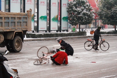 今年春节,我们这儿下大雪了,连日的气温骤降使得公路上来不及融化的雪又结上了一层层冰。早上起床,不知路况的上班族可是吃了不少苦头。由于以前没有出现过类似情况,人们也大意了。不管三七二十一急急忙忙赶路,自行车把刚一转弯,就摔了一个大跟头。你瞧,摔跤的不只是骑自行车的,还有骑摩托的,走路的,一个接着一个。由于准备不充分,交警们可是忙坏了。