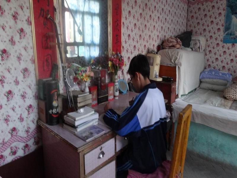 走进他家看到的是纯农户的住宅,方方正正的院子,三面都盖有水泥平房,北面三间是他爷爷奶奶住的;西面是四间,是他爸爸妈妈还有他住的;东面一间是厨房。整个看上去挺整齐的。从外表看这些房子已稍有落后,有些年头了,他爷爷告诉我水泥里面全是土块垒起来的墙。家中他爷爷已是85岁高龄,奶奶也已82岁了。可是看上去挺精神的,平常他爸爸妈妈出外打工回来迟了他奶奶还帮者做饭。