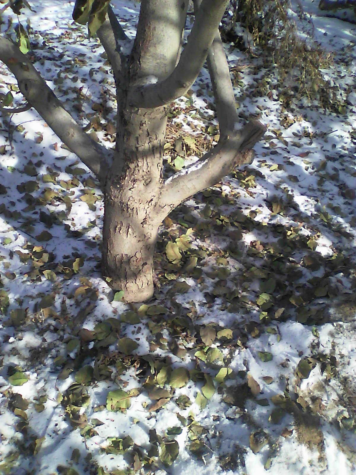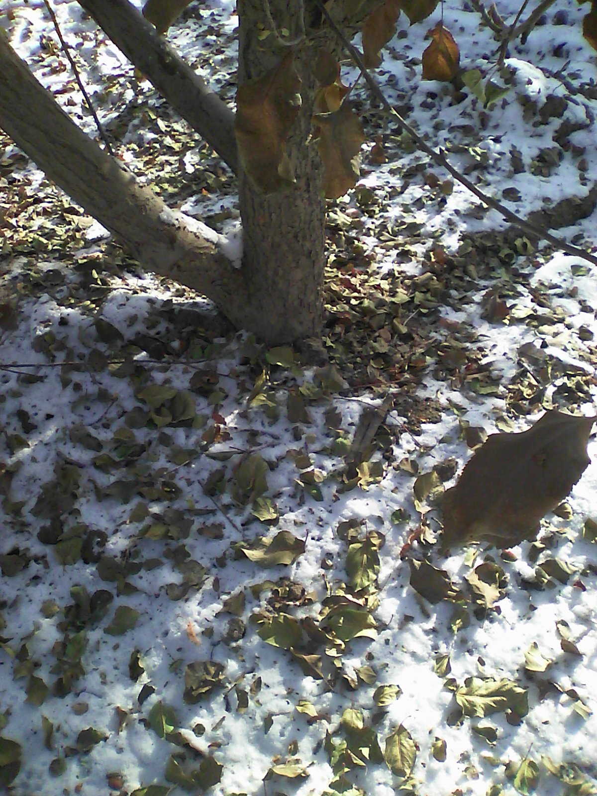 冬日的雪后,我信步走进邻居家的果园,看见一片片树叶落在园子的地面上,树叶和积雪混合在一起若隐若现,构成一幅别样的冬日风景,踩上去软绵绵的十分舒服。