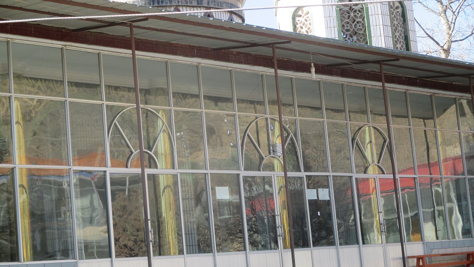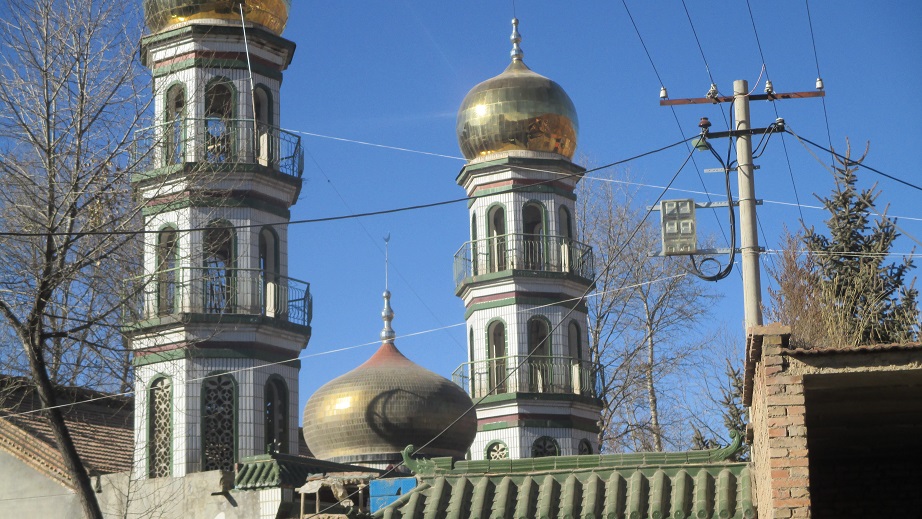 硖门还有一座特色建筑,就是硖门清真寺,它坐落在硖门村的正中央,这样有利于四面的人们做礼拜,硖门清真寺共有两扇门,最大的是正门,正门有三道门组成两边的两道门大小一样,有6道钢管组成,中间的大门有两扇,各用8道钢管组成,走进清真寺里,共有四座房屋,右边的是做礼拜的大殿,没到古尔邦节,从里面的大殿到走廊再到楼梯,都跪满了做礼拜的人,每个人都要向阿訇说:"塞俩目",还有满拉,大殿的右边是花园,花园围着大殿,正门的右侧是阿訇的房间,专门供他休息,旁边还有一个大房间,在大房间里是念古兰经的,正门是右侧是放经书和供满拉休息的。正门前面相对的就是后门,后门也是用钢管组成的,而且很高很建筑。