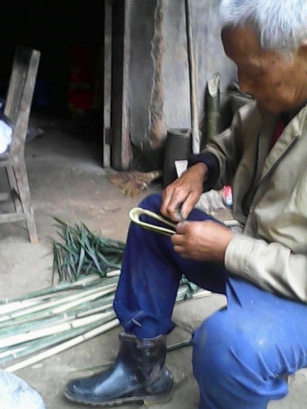 外爷先是把竹子花成一条一条的,每一条都有一定的粗细及长度。然后又将一条一条的折弯,却又不能折断了。外爷又拿来“绳子”系着,固定不让它变回原型,外爷说得用火把它们烤软,可是却又不能把竹子给烤坏了,否则就不能弯折,也就做不成粪系了。那要是火候不够,竹子烧不软,就得用嘴吹木炭,吹燃后,就可以烤了。