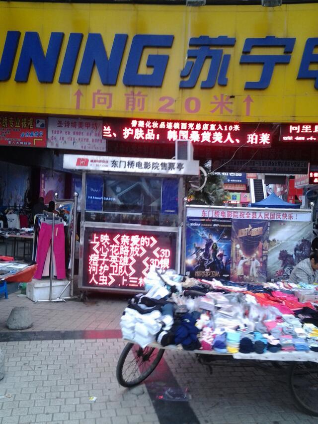 过了地下超市 再往前走一点便是东门桥电影院。里面是什么样子我们不知道,因为我从来也没有去哪里看过电影,每天那都会上映不同的电影,听说票价不贵,但是我也没有去过。至于到底是多少我也就不知道了,电影院是朋友结伴的好去处,也是情侣的最好去处 。