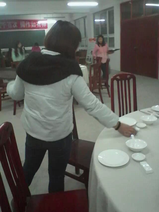 开始学习的时候,杯花也折不好,桌布也铺不端,椅子也拉不正。王老师看到这情况也替我们着急,对我们也严厉起来并说:“这些简单的都做不好,还怎么考试?”说的我们一个个哑口无言。可现在不一样了,我们也能摆出漂亮美观的台面了,也能让我们的学弟学妹来参观了。