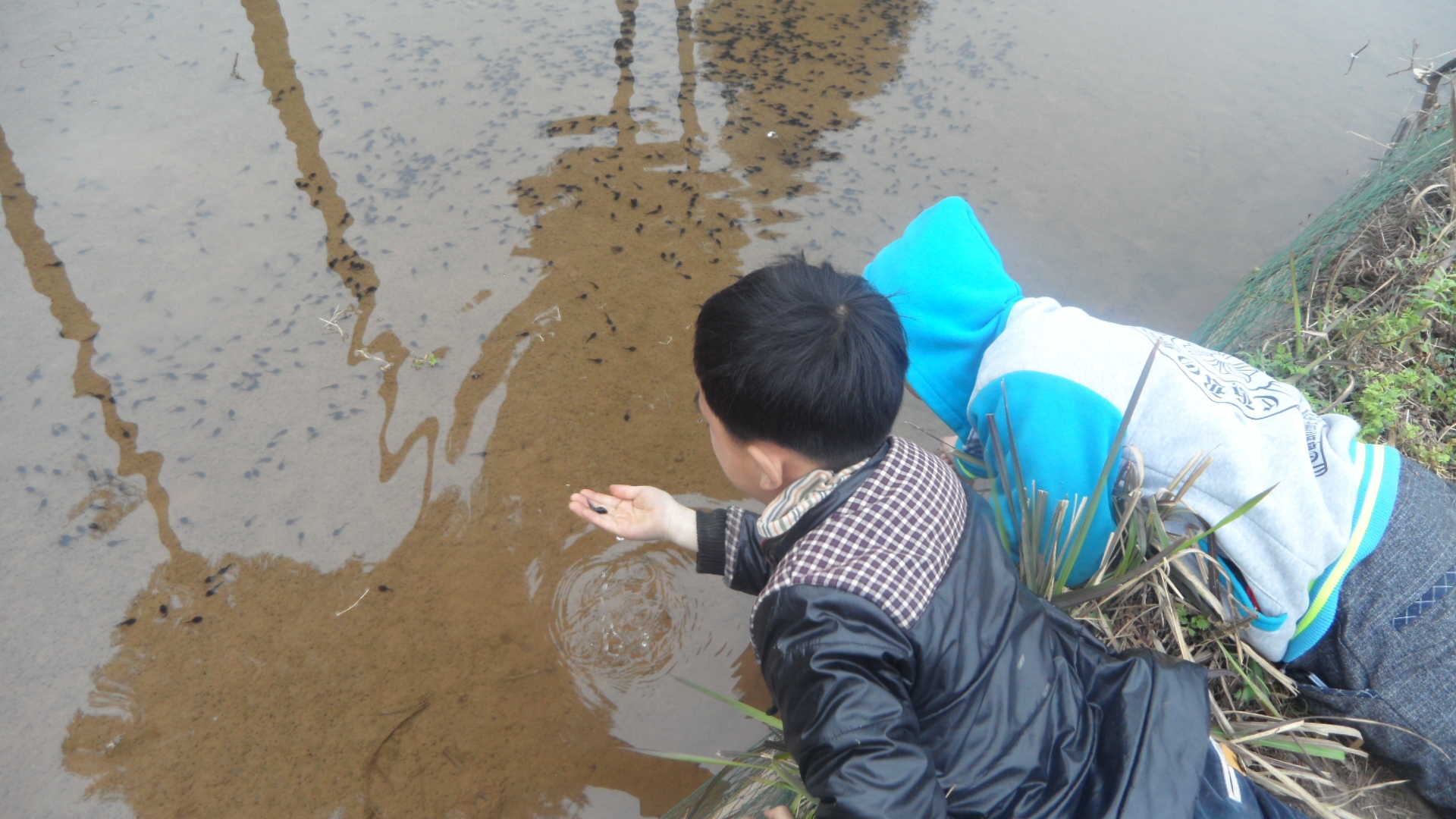 到了田边一看,原来捉蝌蚪的不只是我们两个,还有几个小朋友呢!