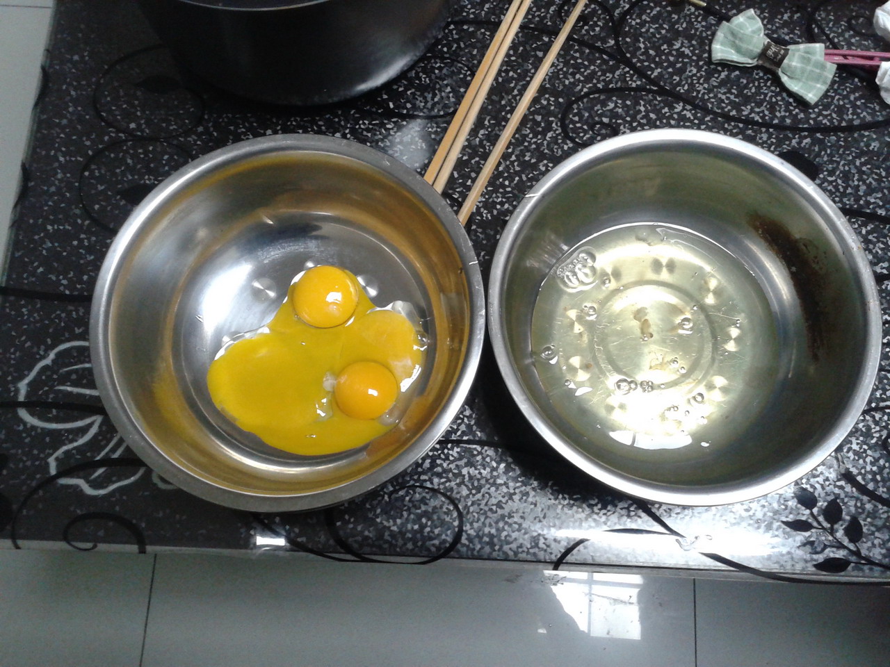 说干就干!首先,我们在网上查询了做蛋糕的方式。然后,把鸡蛋和蛋清分离搅拌:蛋清变“奶油”,蛋黄变“颜料”。
