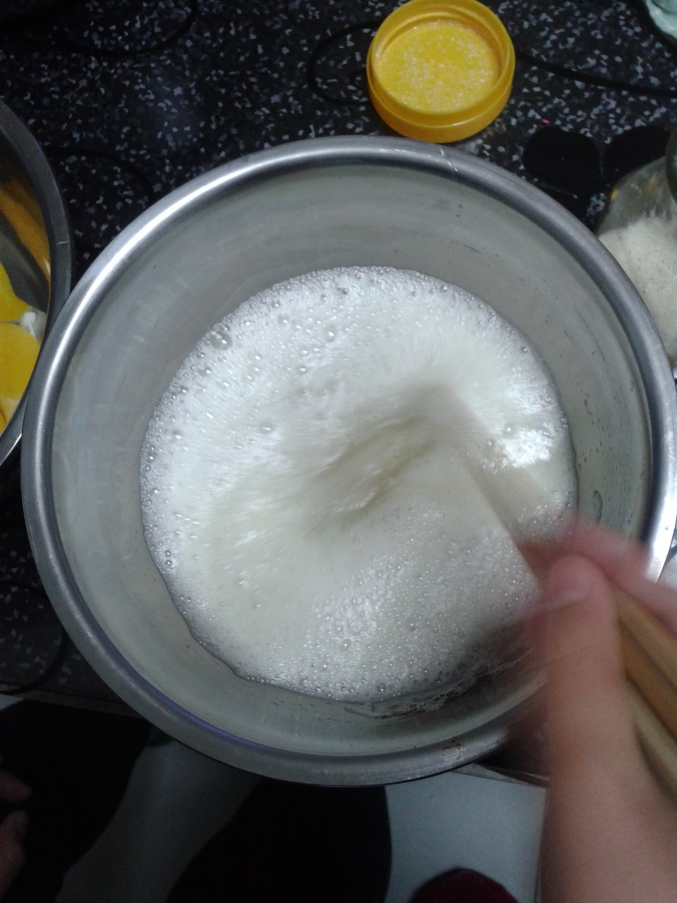 随后,在蛋清中放入糖,继续搅拌20分钟。将蛋清和蛋黄融合,再次上下搅拌10分钟,然后放入锅中。