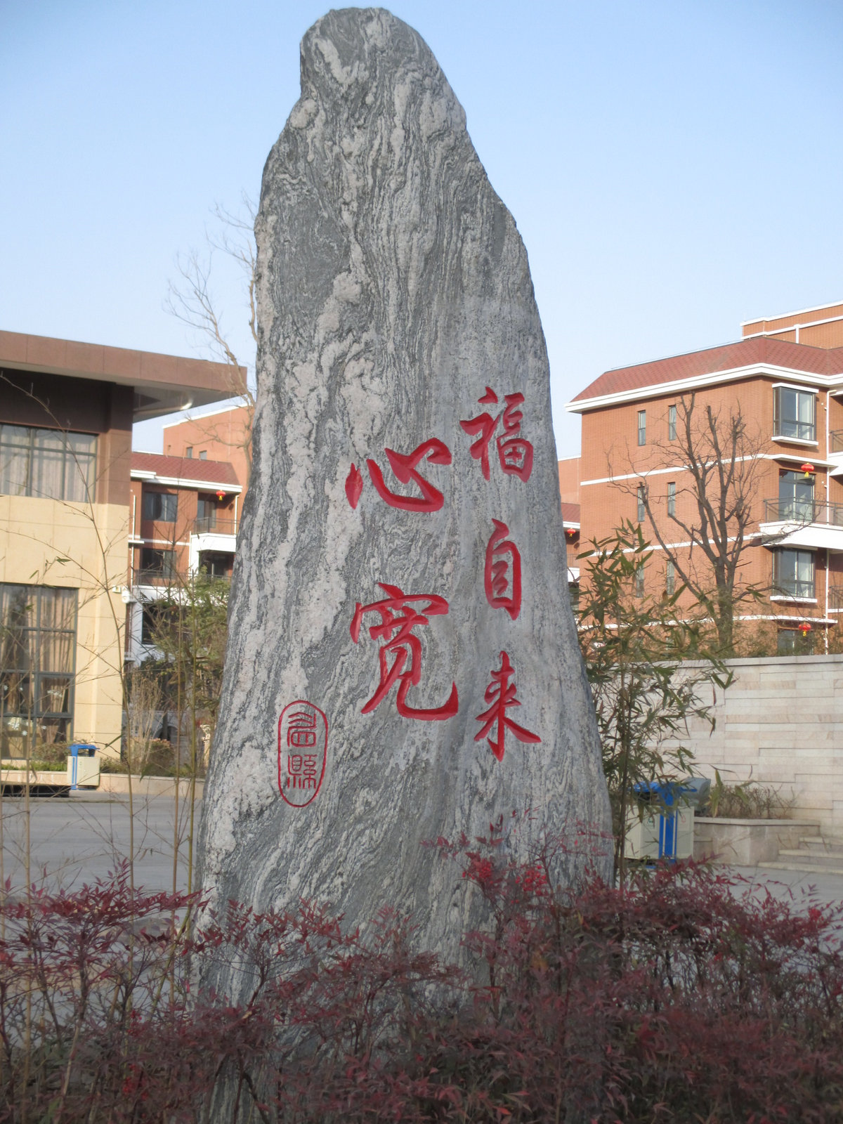 俗话说;心宽福自来,这块大石头上赫然书写着这五个镌秀的大字。让人不免在它身旁多停留一会。