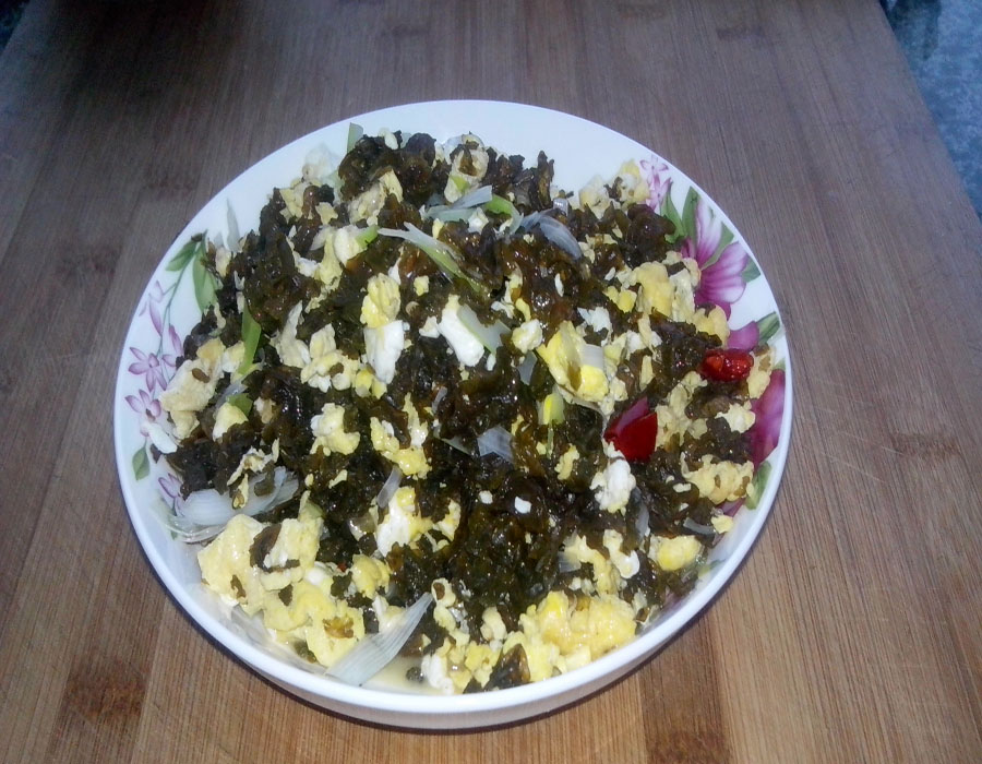 然后在碗里打三个鸡蛋并打散散的;炒锅里放油,烧热后把鸡蛋细细的往锅里倒,边倒边用筷子划成蛋絮,盛出鸡蛋;锅里再倒一点油、下地达菜翻炒、将炒好的鸡蛋回锅,用盐酱油和糖调味儿,撒入葱花;现在就可以装盘开吃啦。 瞧瞧......多香的美味佳肴啊!!!