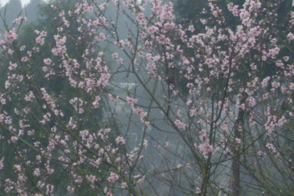 远处,雨中的"桃林"像一片红云,飘于枝头,一簇簇地开满树梢,粉嘟嘟的,惹人怜爱,青青的嫩叶从中挤出来,粉绿相映,呵,还真是应了那句话"鲜花需要绿叶来陪衬的"一朵小小的桃花,粉红的五片圆形花瓣。黄黄的细丝状蕊点缀其中,风儿吹来,树枝在风中起舞,细长的雨丝打在它们身上,一个个摇头晃脑,似乎在享受这春雨,尽情地吮吸上天赐予的乳汁。俯视地上星星点点的残花,唉!再好的花儿也要谢啊!花季短暂,有的还未开,有的却已凋零,我们要好好珍惜这短暂但却美好的花期。风儿依旧,雨儿依旧,桃花却已不同,盛开的桃花真美。