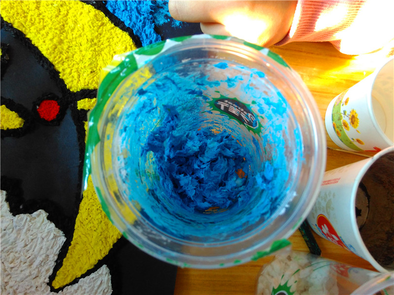 卫生纸剪好后就可以开始调颜料了,将一些卫生纸放进杯子里,然后适当的加一点胶水、胶水是保证在晒干后才会凝固,在加点染色的颜料和清水进行搅拌,卫生纸完全吸收后而且完全变成纯颜色后,再将卫生纸多余的水分给它压干,这样就可以避免湿透模型纸了,况且也可以加快晒干的速度。颜料调好后就可以正式开始手工制作了,先是将提前画好的模型放在桌子上,然后一手捏着一把镊子,一手拿着一根牙签,在用镊子夹着黄颜色的卫生纸,从月亮的一角一点一点的给它粘好,用牙签把卫生纸给它渣细了就像剁肉一样。