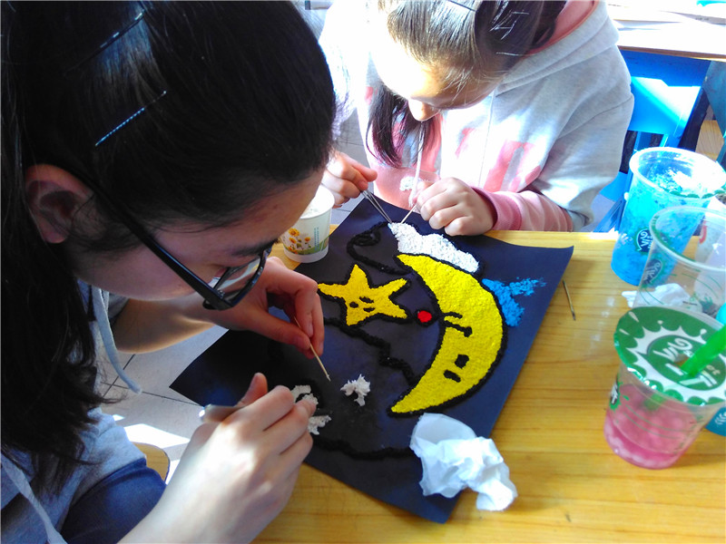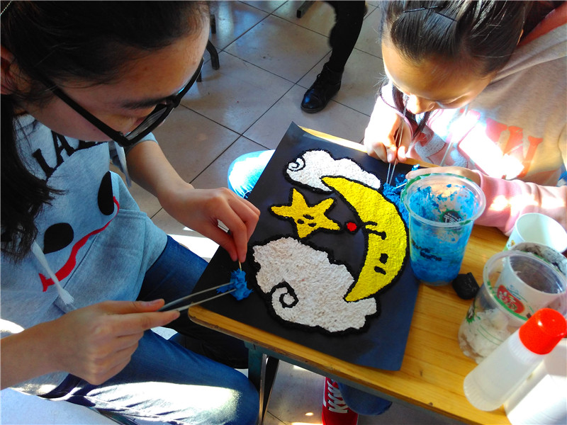然后再给它弄平整,摸上去软绵绵的就可以了,月亮做好后还有白云和星星用同样的做法把卫生纸夹到模型上去在用镊子和牙签给它修整修整就好了。做手工画是一件很有趣的事,也是一件考验人耐心的事,俗话说:“功夫不负有心人,铁棒都能磨成绣花针”。一切弄好后就大功告成了,最后就是将手工画放在太阳下进行晒干水分就好了。同桌的手工画做的很漂亮,不妨你也动手试一试吧!